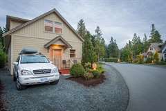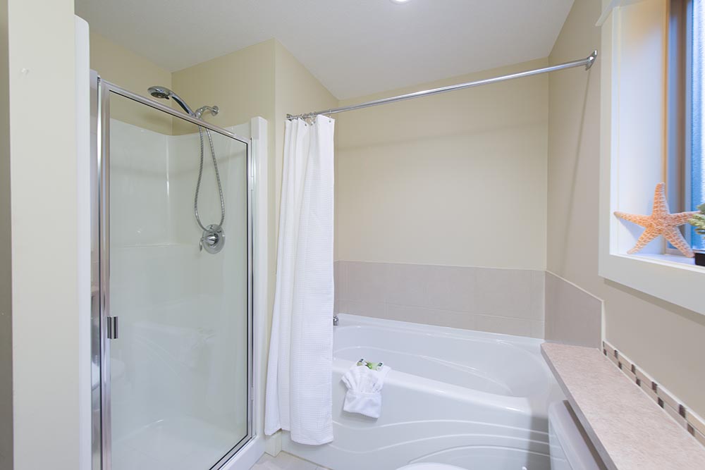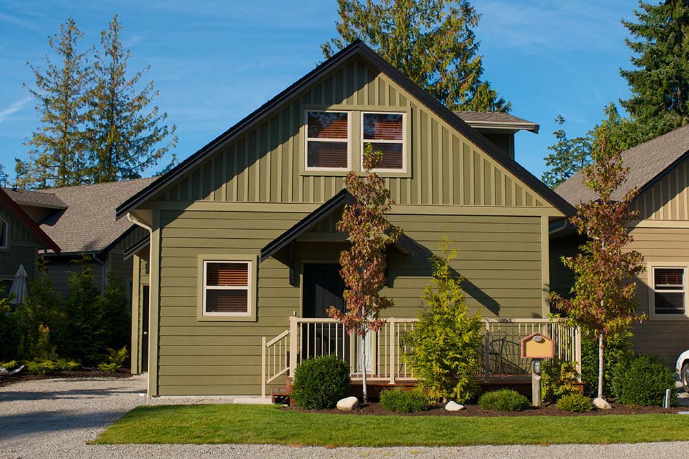 The Dogwood cottage has a versatile floor plan, with the added bonus of a second bathroom in the loft (perfect for extra guests!). The cottage's living room has a vaulted cedar ceiling and a beautiful fireplace. The fresh open-concept living and eating area is a wonderful space to spend time with family and friends on your Vancouver Island getaway.